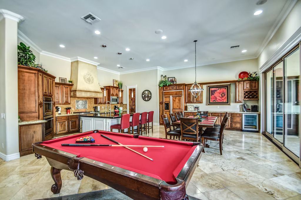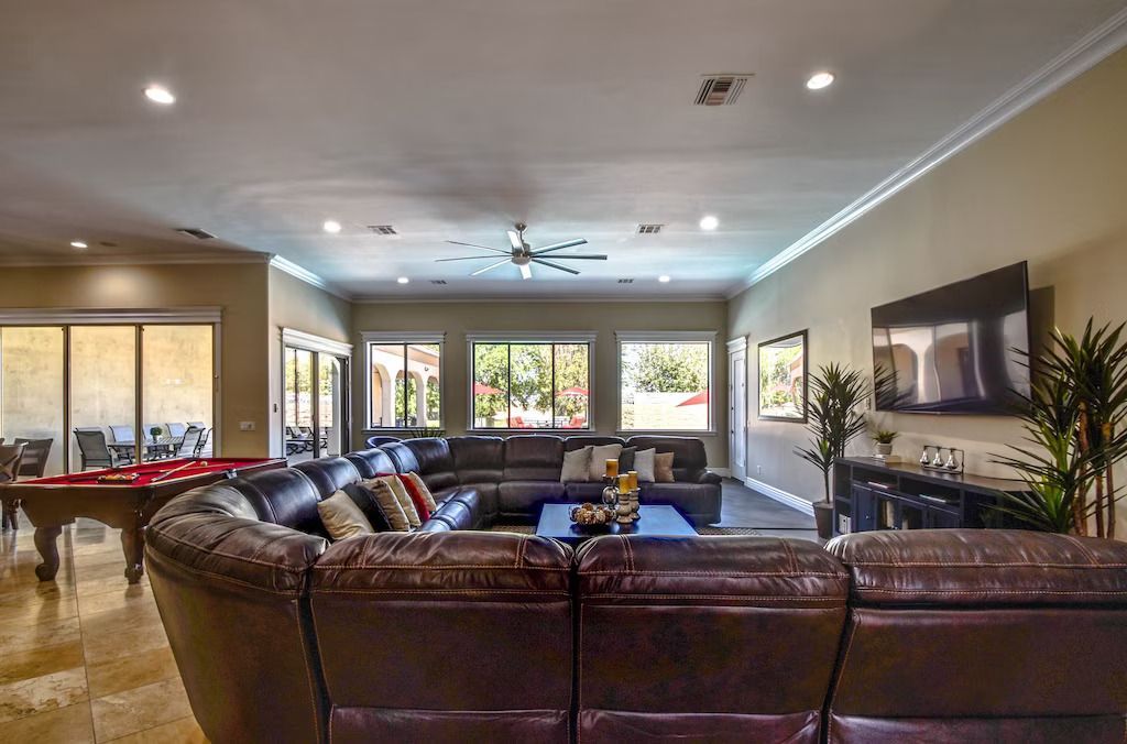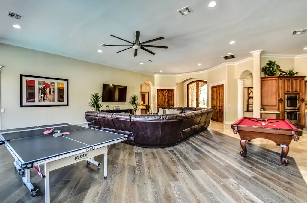 The living room has an 82" HD Smart TV, large leather sectional with built-in electric recliners, Ping pong table and pool table.