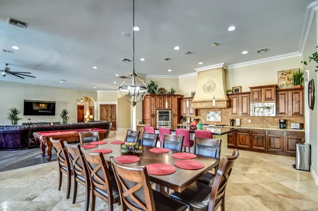 4,000 sq.ft. on a large 1+ acre lot with tons of room to spread out and enjoy yourself. This is a one-story home with 5 bedrooms, 3 full bathrooms, custom pool, large backyard with LARGE BACKYARD that has a HUGE GRASS LAWN, YARD GAMES, POOL TABLE, FOOSBALL, PING PONG TABLE! There's a full-kitchen with high-end appliances plus an outdoor kitchen and this amazing house can accommodate up to 15 guests in beds.