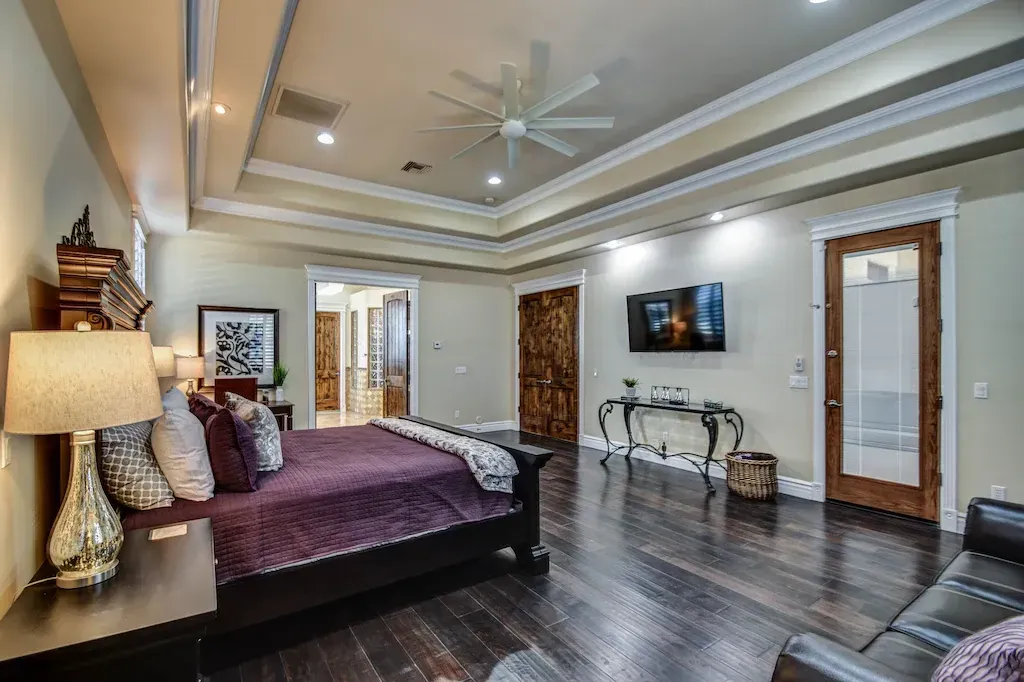 1) MASTER BEDROOM: (sleeps max. of 4) 1 King-Size Bed plus one Queen-size sofa sleeper, Writing desk, en-suite bathroom, large walk-in closet, spa-tub, separate his/hers sinks, 60" HD smart TV and separate entry to the pool area.