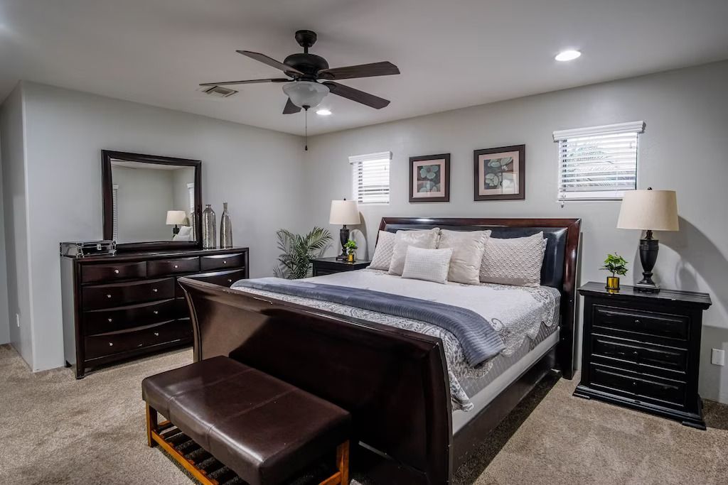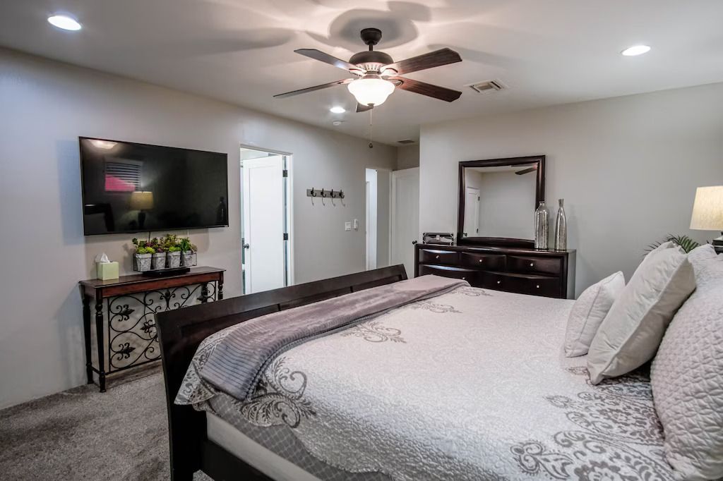 The Master Bedroom has a King-size Sealy-Posturpedic mattress along with a 32' Flat screen HD TV (and cable) . The Master Bedroom is tastefully decorated and features a walk-in closet and its own full bath with granite countertops & double sinks.