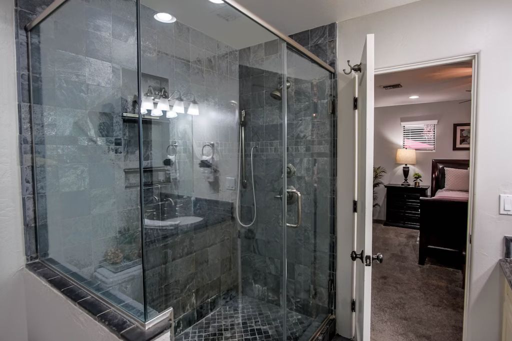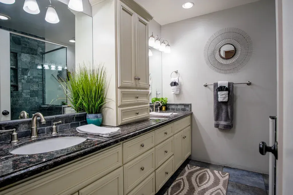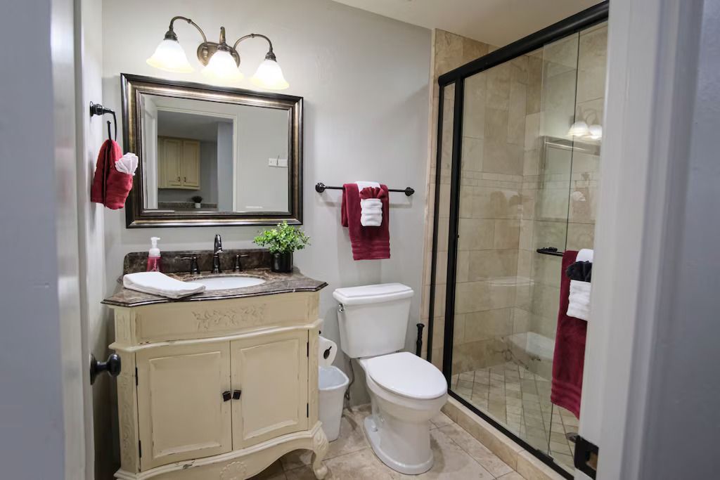 The second bathroom is lovely and spacious. It has a full size, walk-in shower with travertine tile and a custom vanity with a granite countertop.