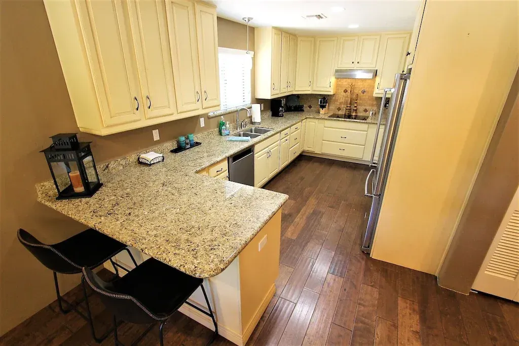 Featuring Real wood flooring, custom wood shutters and wood blinds, a fully-stocked kitchen, washer and dryer, seating for 6 in dining room plus a breakfast bar and large kitchen, it's own pool and spa as well as a small putting green, this property will not disappoint you!